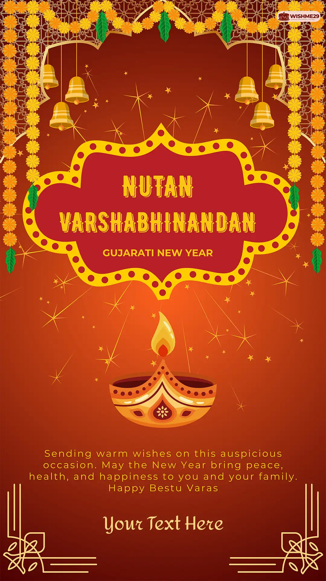 Begin the Gujarati New Year with a personalized touch by creating a festive greeting using our Nutan Varshabhinandan WhatsApp Status Card With Name Editor. www.wishme29.in helps you design elegant and meaningful Gujarati festival wishes that can be instantly shared as a WhatsApp status, Instagram story, or Facebook post. By adding your name and image, your greeting stands out beautifully during this auspicious occasion.