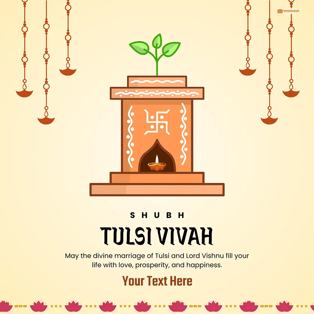 Celebrate devotion and love this sacred season with a Tulsi Vivah 2025 e-card with name and picture. Tulsi Vivah marks the divine marriage of Goddess Tulsi and Lord Vishnu, symbolizing purity, prosperity, and blessings. Now you can express your heartfelt wishes through our online Tulsi Vivah festival e-card maker with name, designed to make your greetings more personal and meaningful.